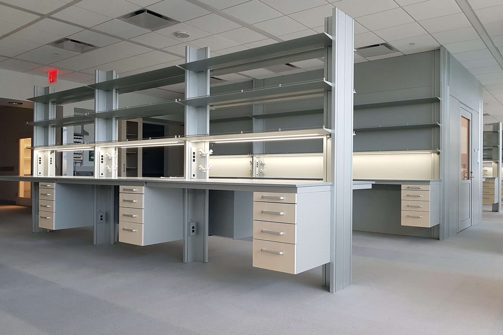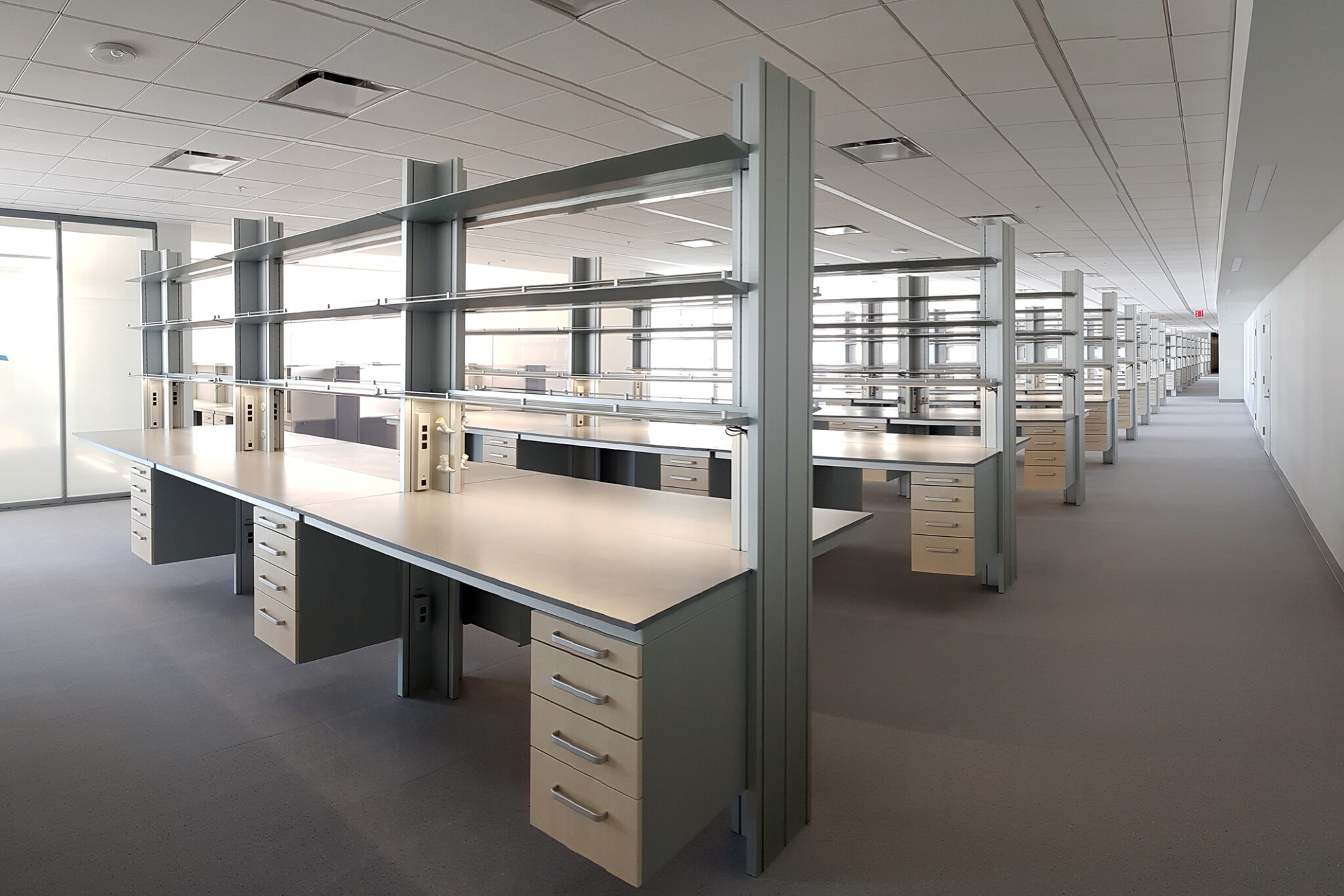 Built for cleanability, chemical resistance, and ergonomic comfort, Kristal benches feature integrated utility channels, accessory rails, and optional shelving or suspended cabinetry - supporting seamless connections to power, data, and lab gases. Its fixed structure ensures stability and alignment in high-use environments, making it ideal for research labs, teaching spaces, and technical zones.