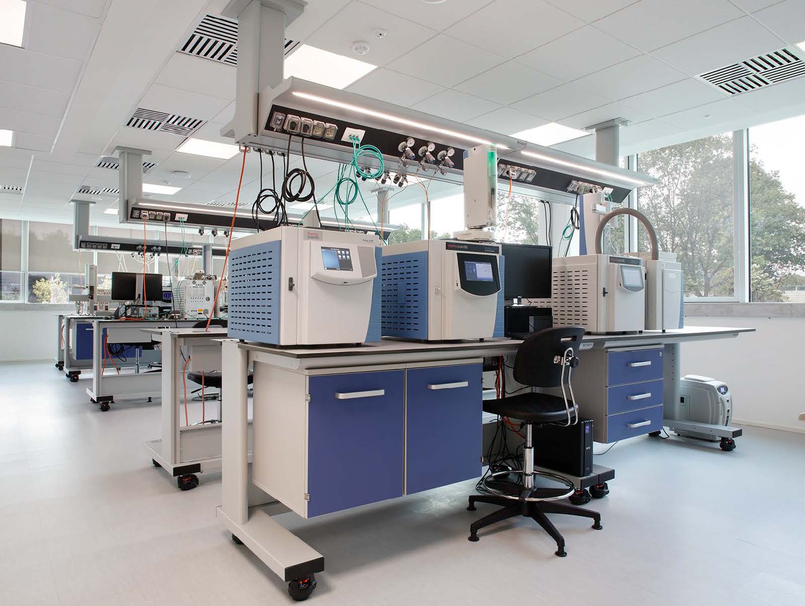 The laboratory’s core services are supported by the IKARO Full suspended beam system, designed to keep the workspace open, flexible, and easily maintainable.