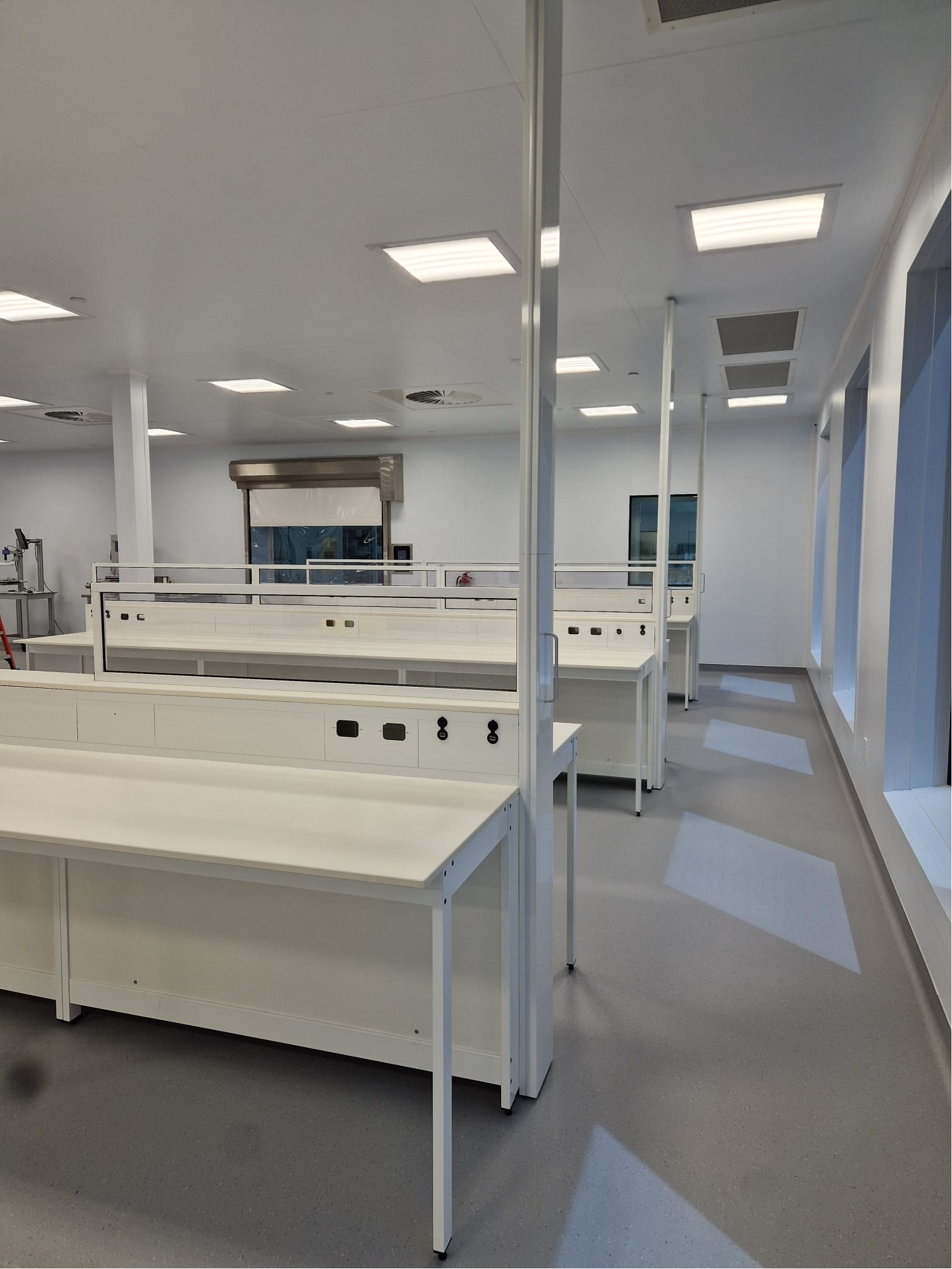 Our engineering team developed a series of custom benches and work surfaces, each tailored to the client’s exact workflow and spatial constraints. This included extra‑long benches with integrated utilities and vertical chases extending to the ceiling, ensuring that all services were fully enclosed, easy to sanitize, and compliant with their internal standards.
